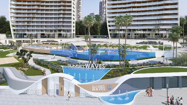 Sunset Waves heeft een avant-gardistisch design met een vleugje verfijning dat de skyline van het Poniente-strand van Benidorm moderniseert. Het is een kolossaal project van meer dan 20.000 m2 met gemeenschappelijke en recreatieve ruimtes van in totaal meer dan 10.000 m2 en met uitgebreide, goed onderhouden tuinen, 3 zwembaden, 3 whirlpools, een chillout lounge ruimte met 2 bars, een natte en een droge, en een strandruimte van in totaal meer dan 2000 m2 met natuurgras… onder andere.